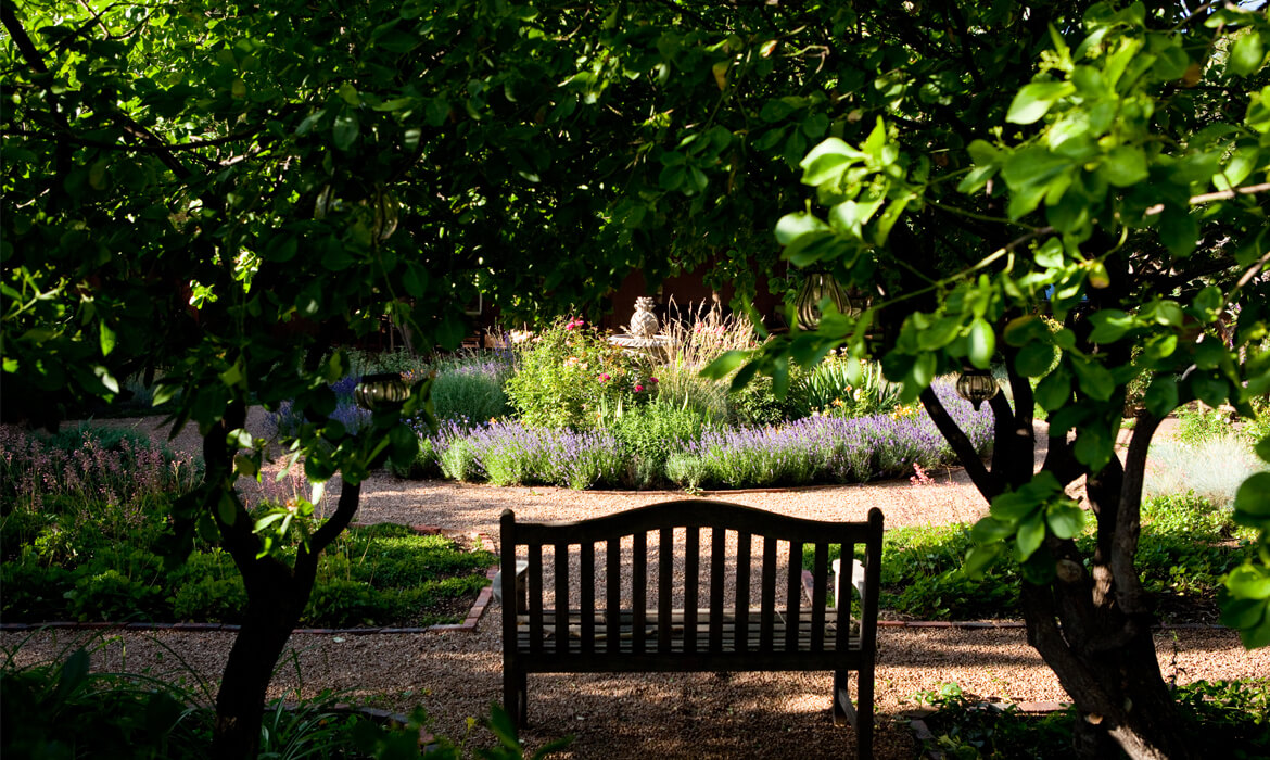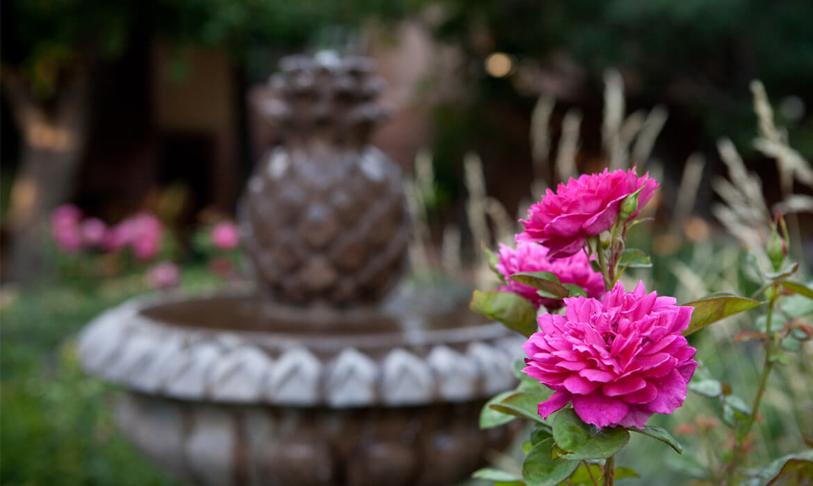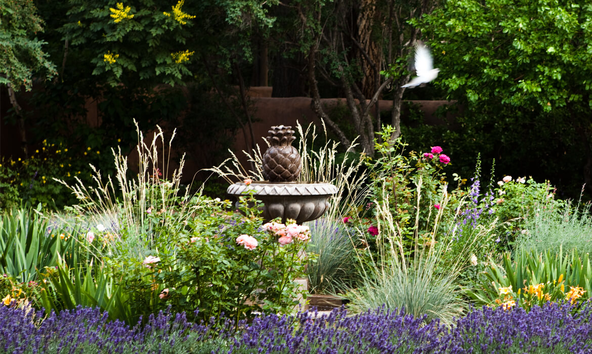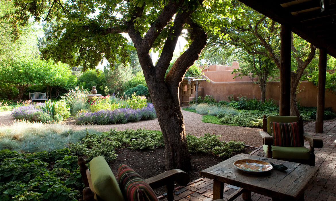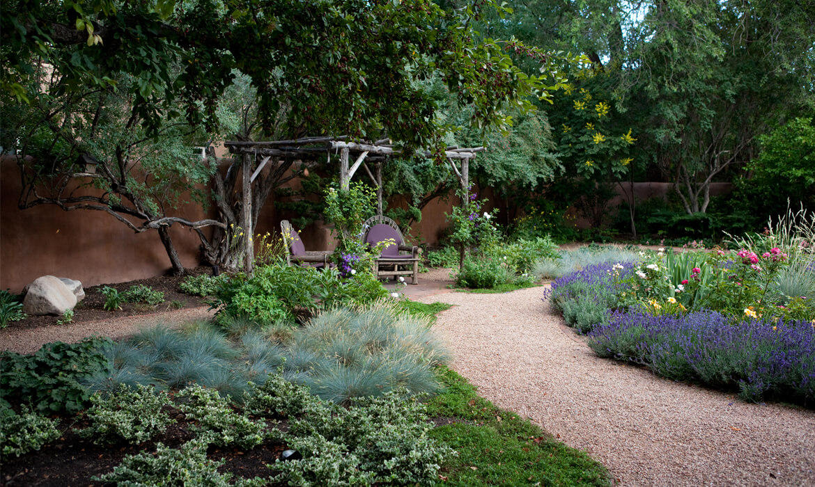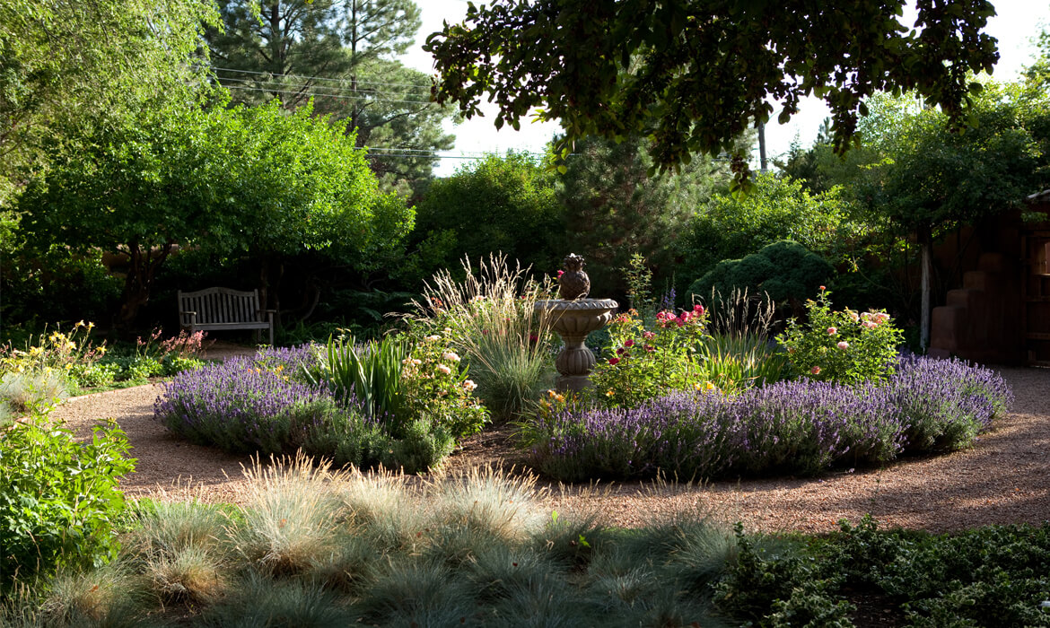 Santa Fe’s historic east side is the ideal environment to showcase a garden style that is reminiscent of Santa Fe’s early European immigrants who grew ornamental gardens that included roses. This Acequia Madre garden refers back to an earlier era where we would have seen roses, irises, lavender and daylilies gracing the adobe architecture, but the old-timey cultivars are reconsidered in this new garden. Instead we have roses by the English rose breeder, David Austin, new irises varieties that re-bloom, long blooming daylilies, hardy peony selections, and we’ve added ornamental grasses.