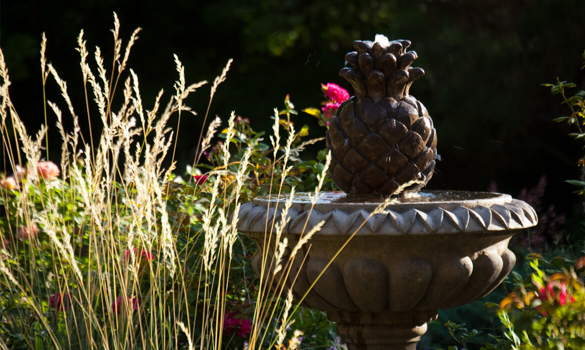 The formal, yet abundant and colorful, circular garden has an old fountain as its centerpiece, and the loosely quadrangular beds that surround the circle contain plants with chartreuse and blue foliage. Older established trees and large shrubs were kept in the remodel process, and they provide a context for the new plantings. The traditional portal provides sheltered outdoor living in the summer months where views to the garden are appreciated. The garden is used for entertaining large groups, smaller dinner parties, and intimate conversation in secluded seating areas.