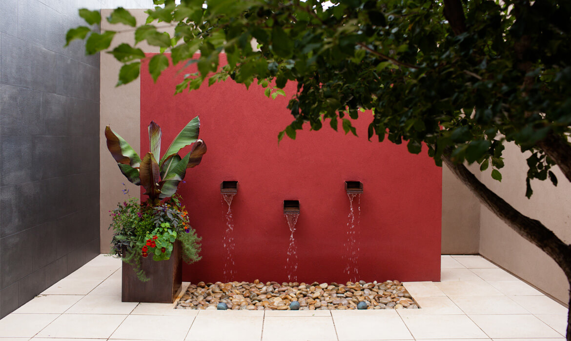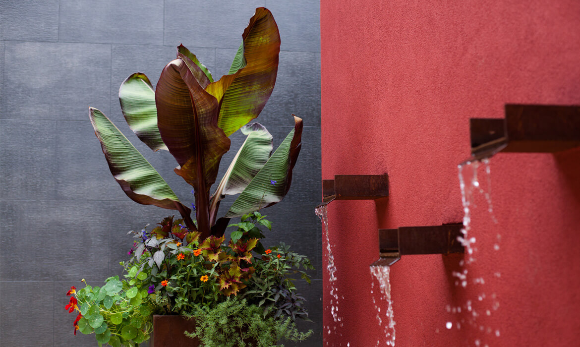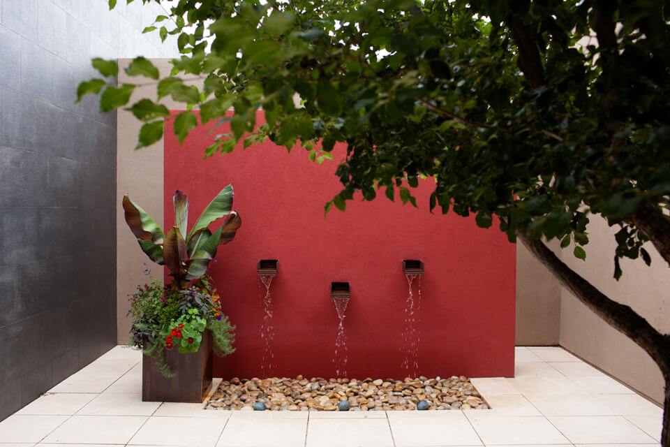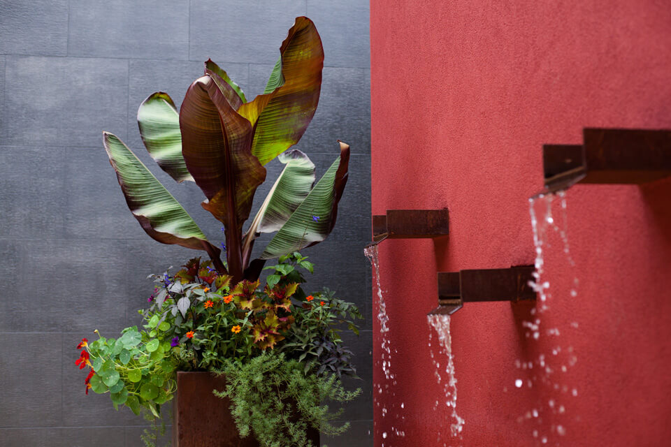 Plants are chosen for their drama and seasonal interest, and are arranged in contemporary lines, drifts, and clusters. A central courtyard with a red wall fountain has a shade tree and custom fabricated steel containers. Water is harvest in cisterns, which source an automated irrigation system for the mostly native and xeric plantings.