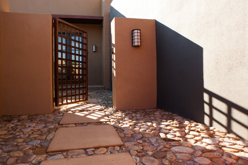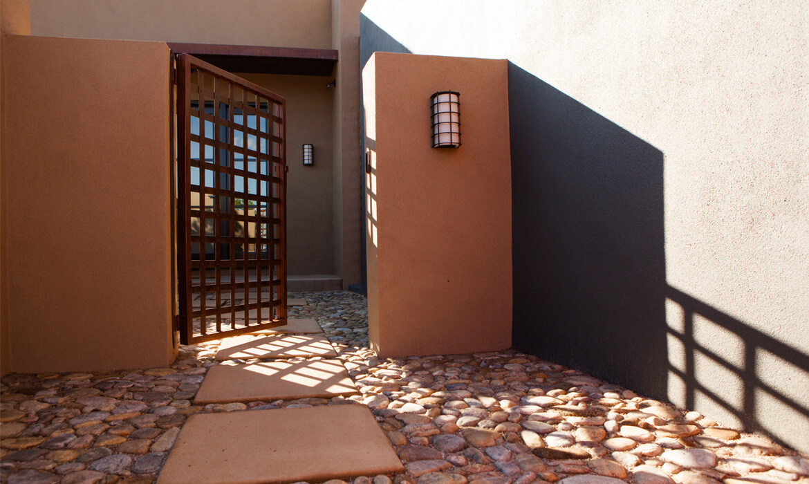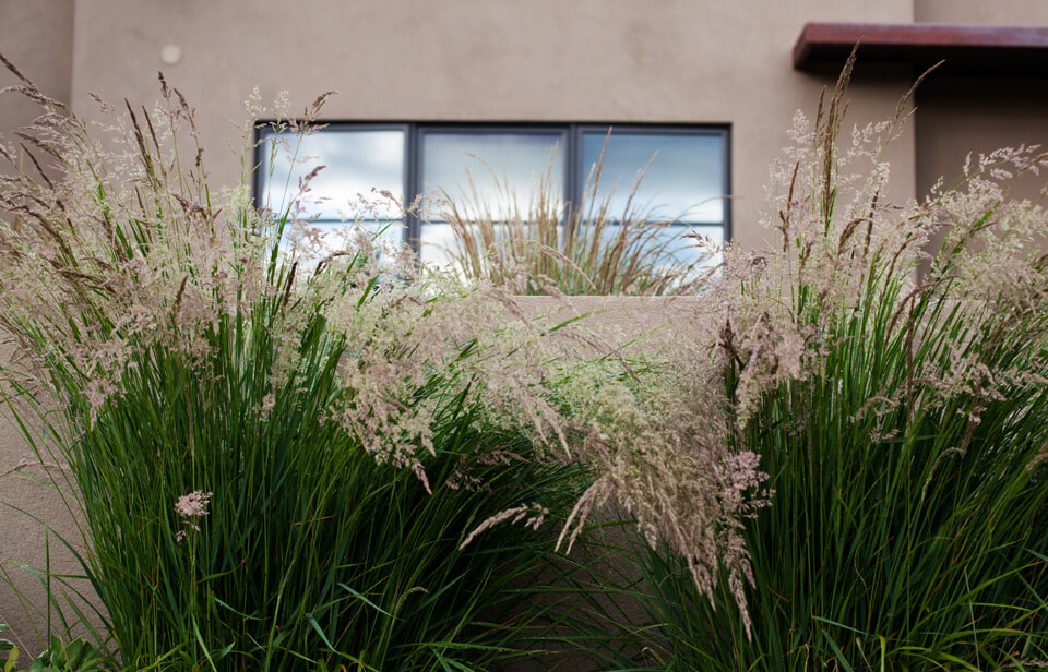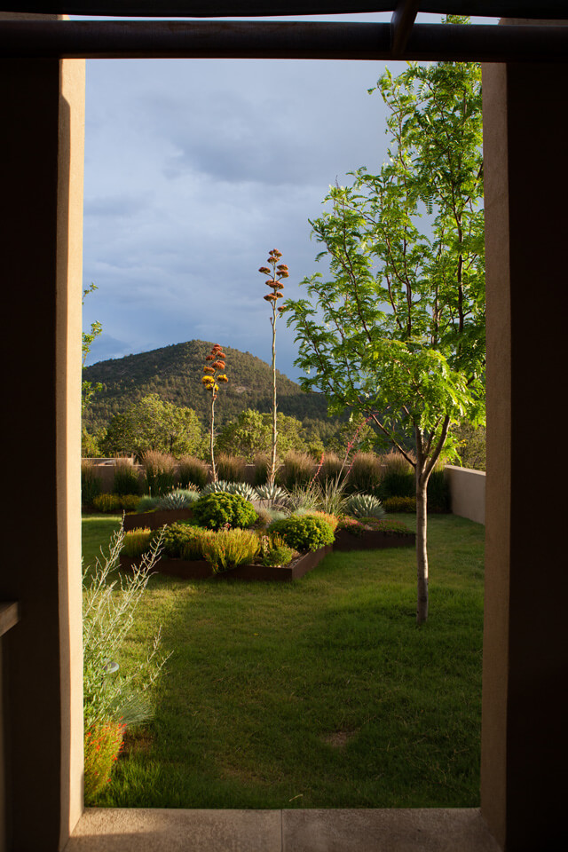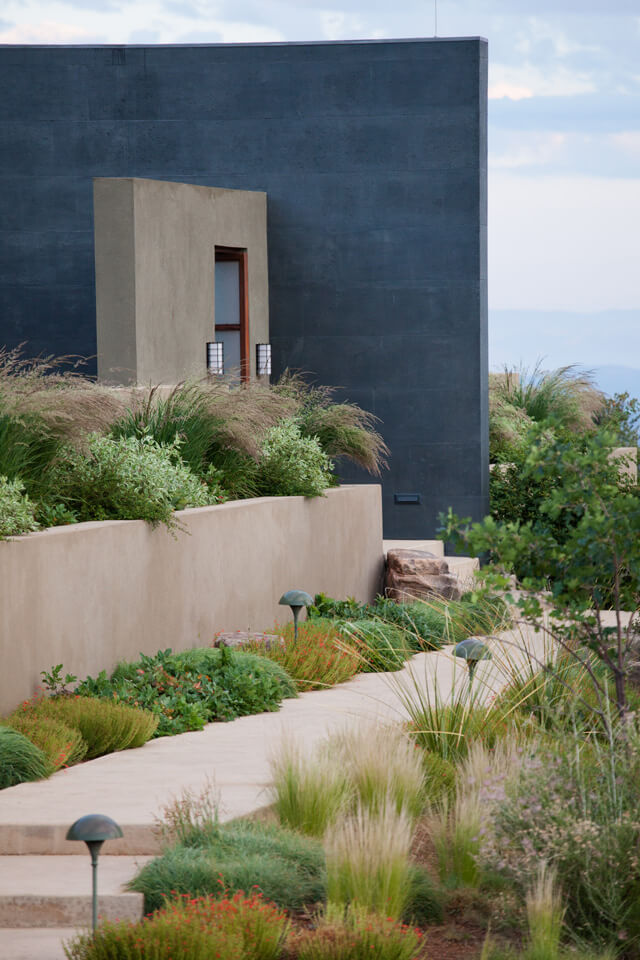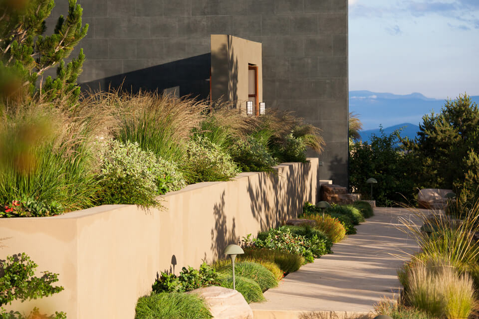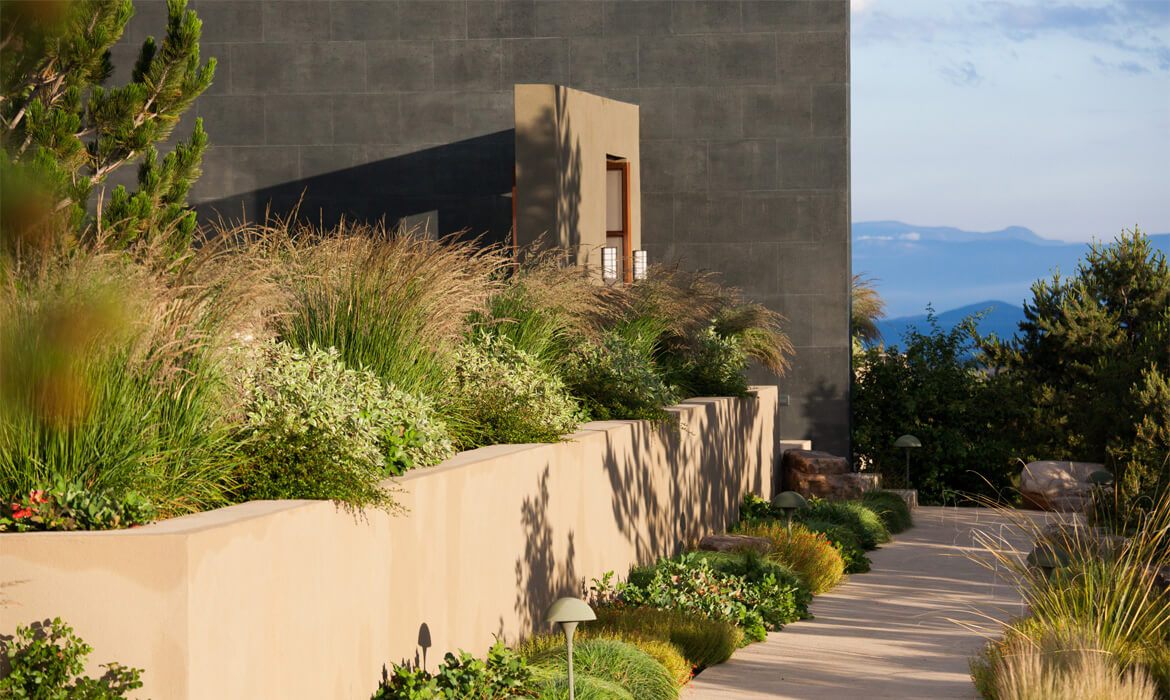Located in the foothills of the Sangre de Cristo Mountains, the soft contemporary architecture of this home is oriented to both near and distant views of the mountains of Santa Fe. The location and architectural style are fundamental to the design program, inspiring both the hardscape and planting plan.