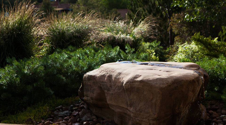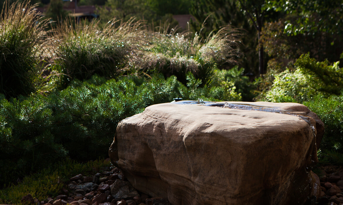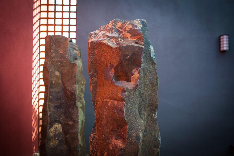 Boulders interrupt the linear cement walkway that leads to the entry courtyard; inside the courtyard water softly circulates over a natural boulder used as a fountain; large boulders are placed to retain slopes and naturalize reclaimed areas. Other impressive stonework includes exotic vertically positioned basalt crystals juxtaposed to a tomato-red wall and organic pebble mosaic paving laid next to square cement landings.