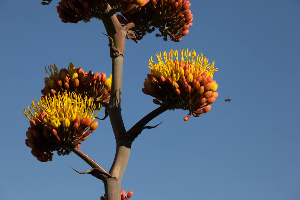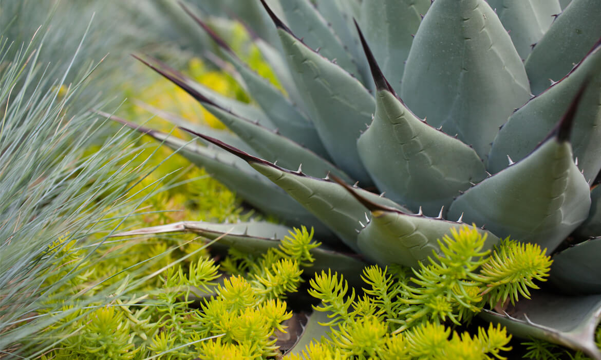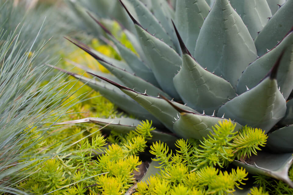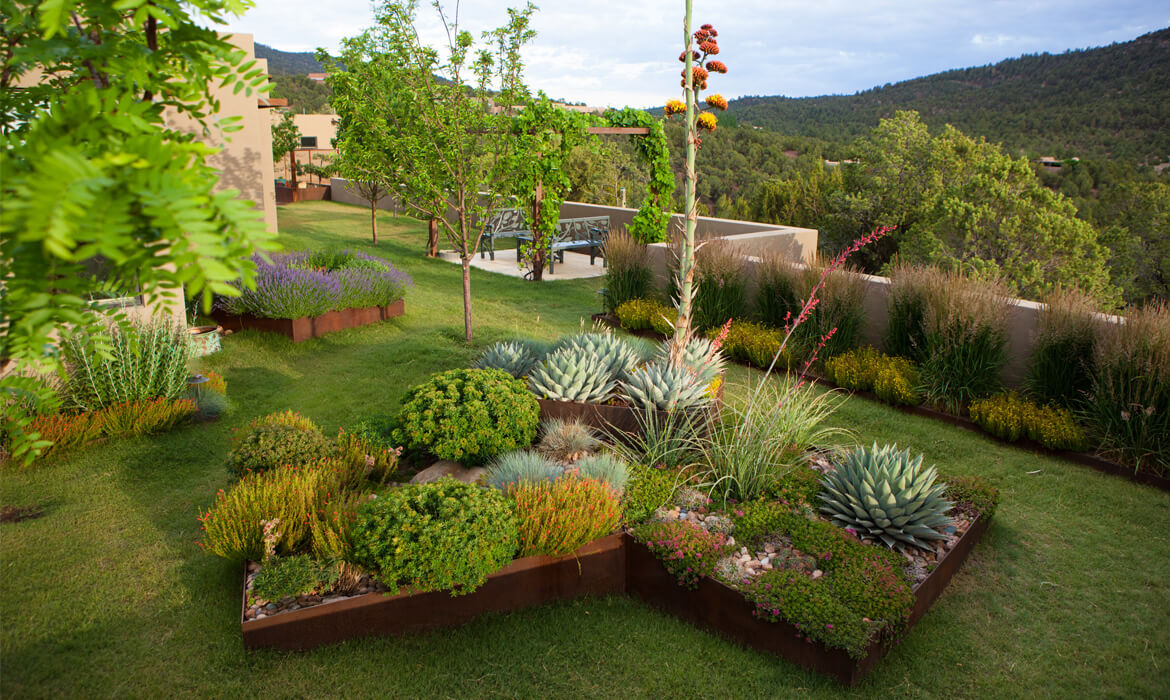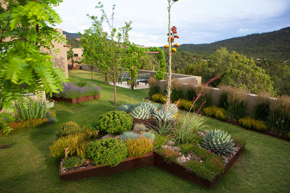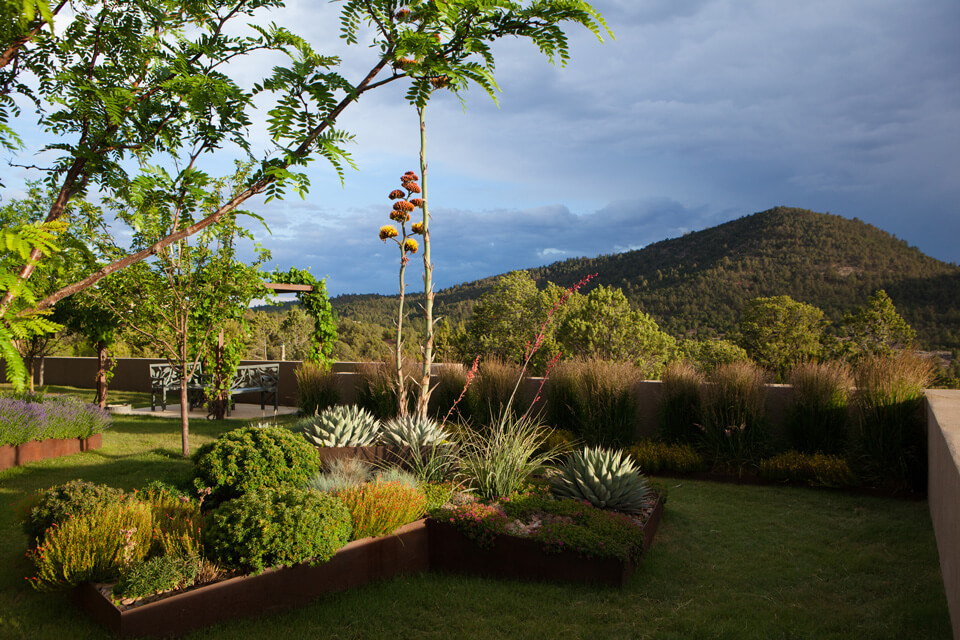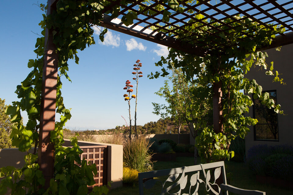 Steel mesh is used architecturally for gates and to enclose a vegetable garden; steel plate is used for custom-designed raised beds that are focal points in the walled south courtyard. One of the beds is a cluster of three trapezoids, each at a different height, planted with agaves, sedums, cacti, penstemons and ornamental grasses. Surrounding this sculptural element is a low-water-use buffalo grass lawn.