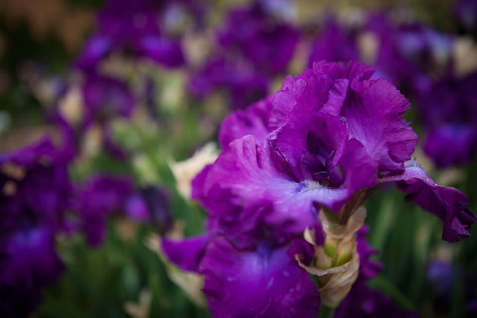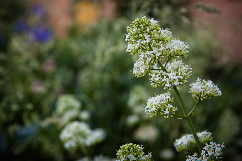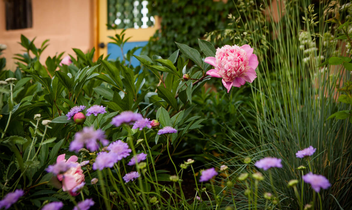 In the center of the large square space is a circular fountain constructed of recycled flagstone, hand painted tiles and a tiered basin. Surrounding the fountain are four triangular-shaped raised stone beds where roses, delphiniums, lilies, peonies, irises, poppies, anemones and geraniums grow amongst the lilacs, viburnums and fruit trees.