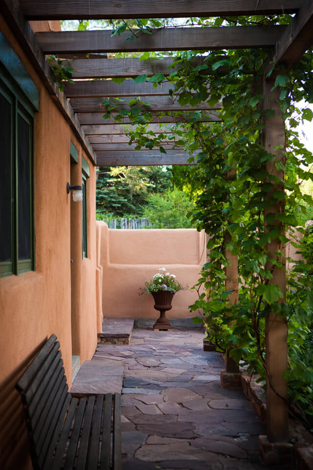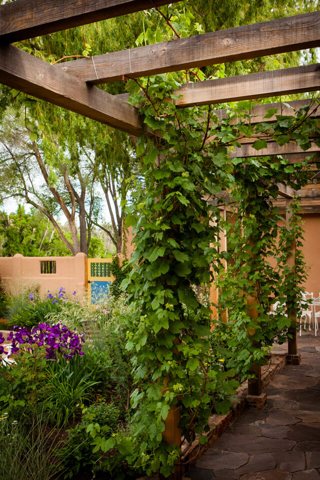 The custom built arbor supports vigorous grape vines and helps provide shade for outdoor living. Rustic recycled flagstone is dry laid to pave the outdoor dining room and arbor floor. Hand crafted gates with historic motifs are stained colors to brighten the courtyard walls where they were installed to guard against rabbits coming into the garden.
