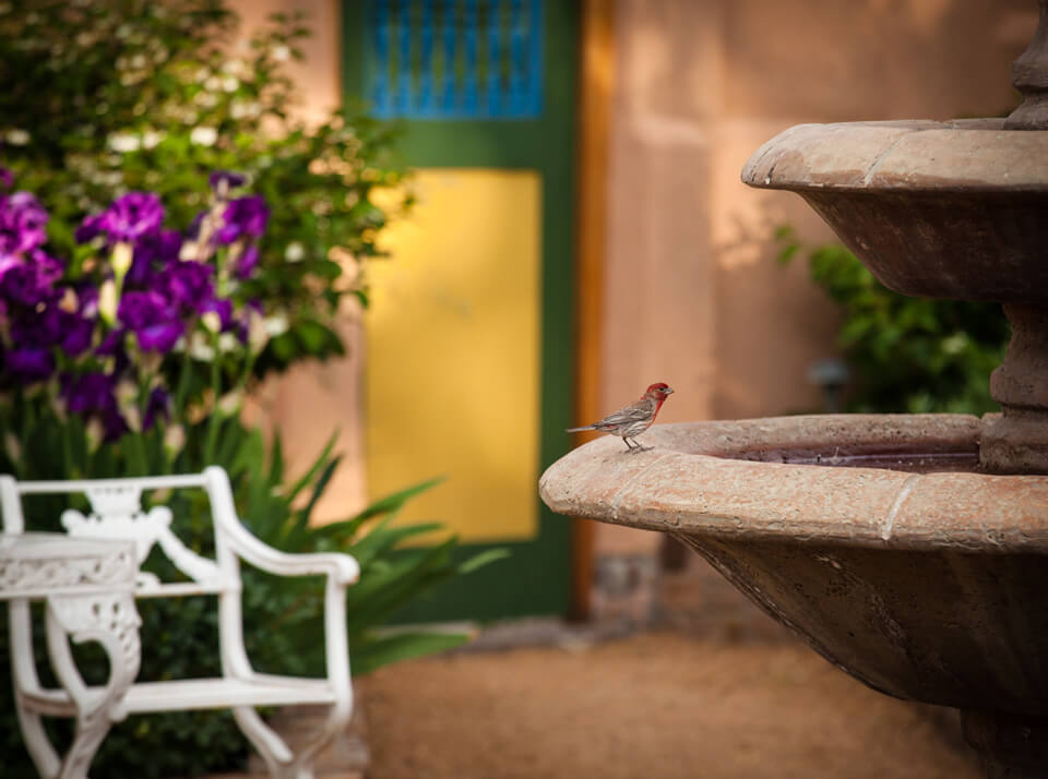 An old weeping willow outside the courtyard drapes gracefully over a portion of the garden, and vintage painted iron furniture evokes nostalgic feelings of times past.